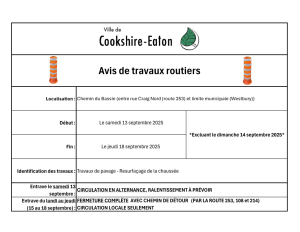 Veuillez noter que des travaux auront lieu sur le chemin du Bassin à compter de ce samedi et se poursuivront en début de semaine prochaine.