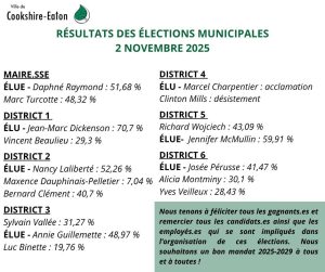 Élections municipales 2025 Cookshire2025-11-03T11:39:16-05:003 novembre 2025|Avis publics, Nouvelles| Voici les résultats : Partager sur les réseaux! FacebookXLinkedInEmail