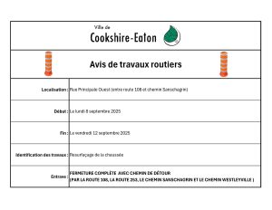 Avis d’entrave – rue Principale Ouest Cookshire2025-09-08T10:51:29-04:008 septembre 2025|Communiqué| Veuillez noter que la rue Principale Ouest sera en travaux du 8 au 12 septembre 2025. Des détours sont à prévoir pour les résidents de ce secteur. Merci de votre compréhension! Partager sur les réseaux! FacebookXLinkedInEmail