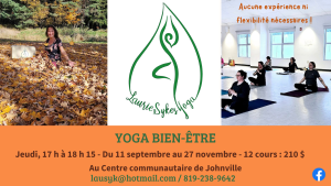Joignez vous à Laurie pour 12 cours dès le 11 septembre 2025, chaque jeudi de 17 h à 18 h 15 au Centre communautaire de Johnville.