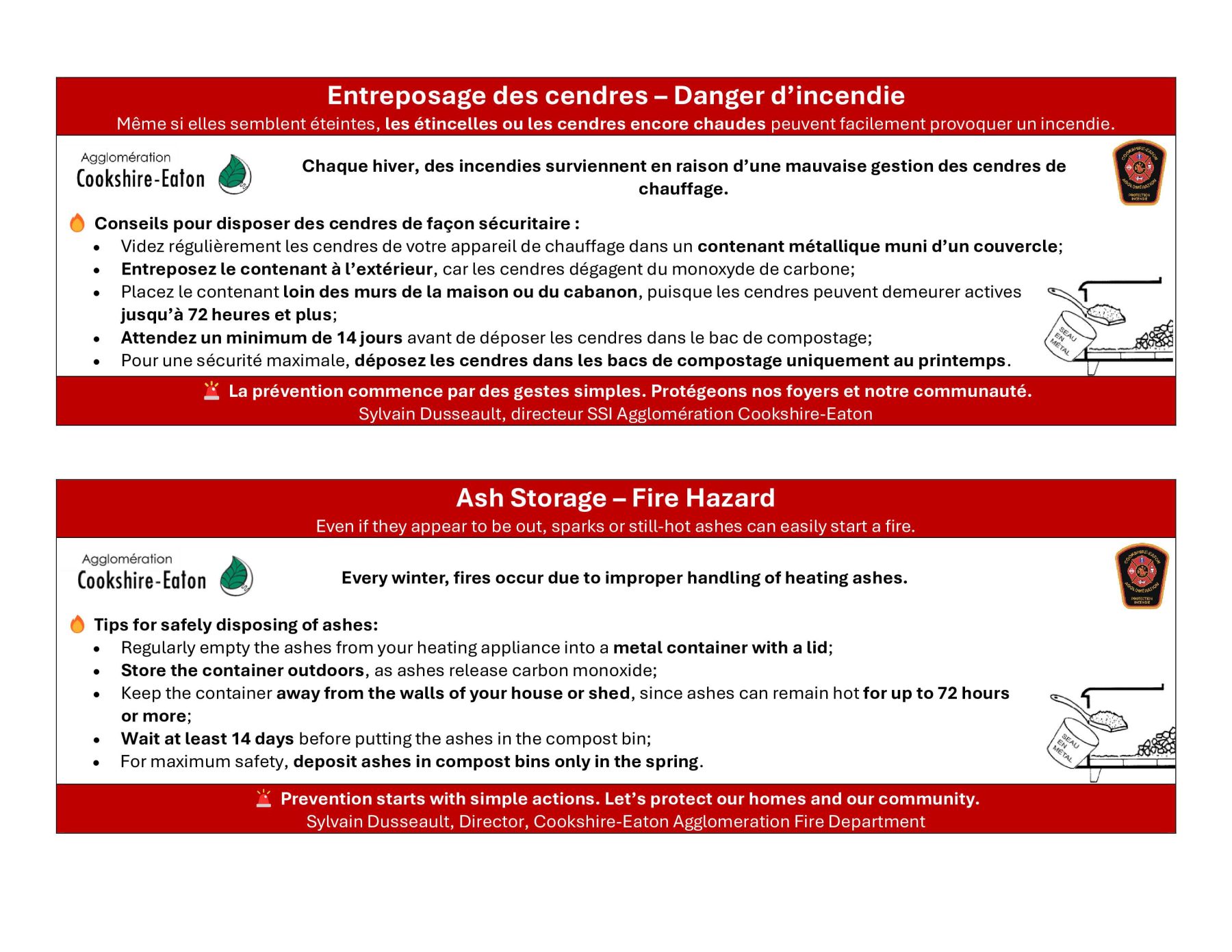 L’Agglomération de Cookshire-Eaton nous rappelle quelques consignes de sécurité essentielles pour manipuler et entreposer vos cendres sans risque.