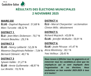 Il est de l’entière responsabilité de la personne désirant poser sa candidature à un poste sur le conseil municipal de la Ville de Cookshire-Eaton de vérifier si elle répond aux conditions d’éligibilité à ce poste. Le président et la secrétaire d’élection ainsi que les membres du personnel d’élection et de l’administration municipale ne sont pas habilités à le faire.